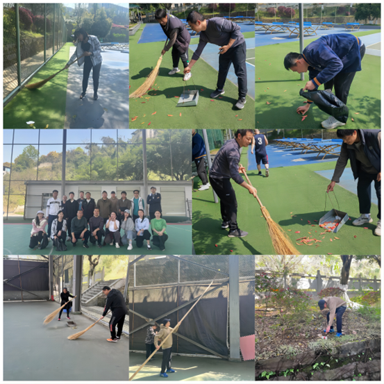 活动中,教师党员分为两个小组,分别由党员唐中伟、陈果带领组内成员,对篮球场、网球场等运动场地进行了卫生清扫,活动中党员同志们分工协作、相互配合,清理“死角”、扫除“盲区”,提升运动场地“颜值”,为全校师生营造干净、整洁的运动环境。