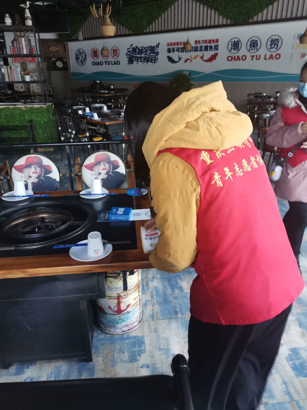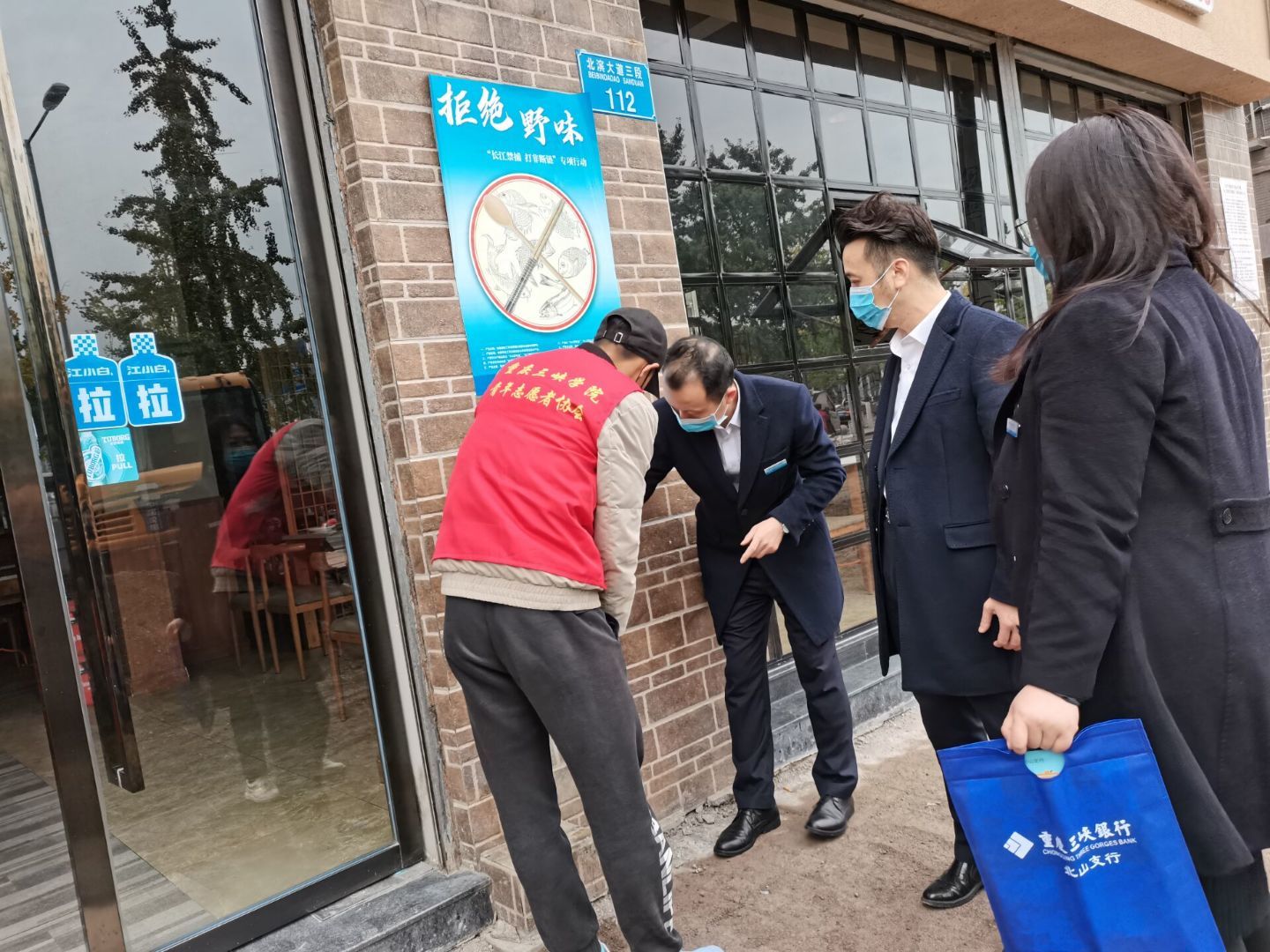 在活动现场,志愿者和干事们一同前往北滨大道,给餐饮行业的店主们介绍不文明用餐的危害。并提供切断病菌在餐桌上传播途径的方法,然后提供力所能及的帮助。志愿者们提倡“吃得合法”“吃得合理”“吃得卫生”“吃得礼貌”“吃得干净”五项要求,引导人们重视文明用餐,并向群众分发传单进行宣传,随后志愿者与干事们合影留念。