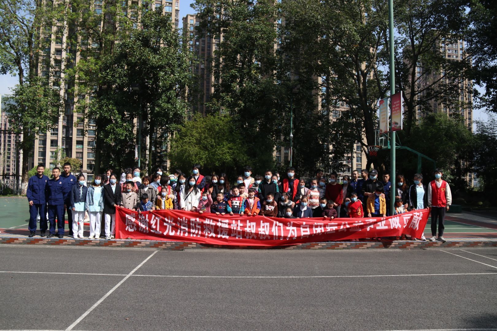 活动开始,消防队员为大家讲解了常见的应急自救方法,展示不常见的消防工具,孩子们对这些工具都充满了好奇。消防队员着重讲解了灭火器的用法,还请孩子进行了演示。接下来,一辆庞大的消防车开到了场地上,孩子们便被面前的消防车深深地吸引住,通过消防员的讲解,孩子们认识了消防水带、切割器、消防水枪、安全防护服等等设备,车上的云梯被一层层升起,场下的小朋友都发出兴奋的欢呼声。活动结束,志愿者与干事们合影留念。