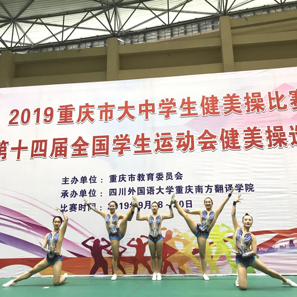 2019年9月18至20日,由重庆市教育委员会主办、四川外国语大学重庆南方翻译学院承办的“2019重庆市大中学生健美操比赛暨第十四届全国学生运动会健美操选拔赛”在重庆綦江举行,我校今年会jinnianhuicom健美操队代表学校参加大学丙组比赛,取得了混双第一名;三人操第二名;男子单人操第二名:五人操第二名的优异成绩。