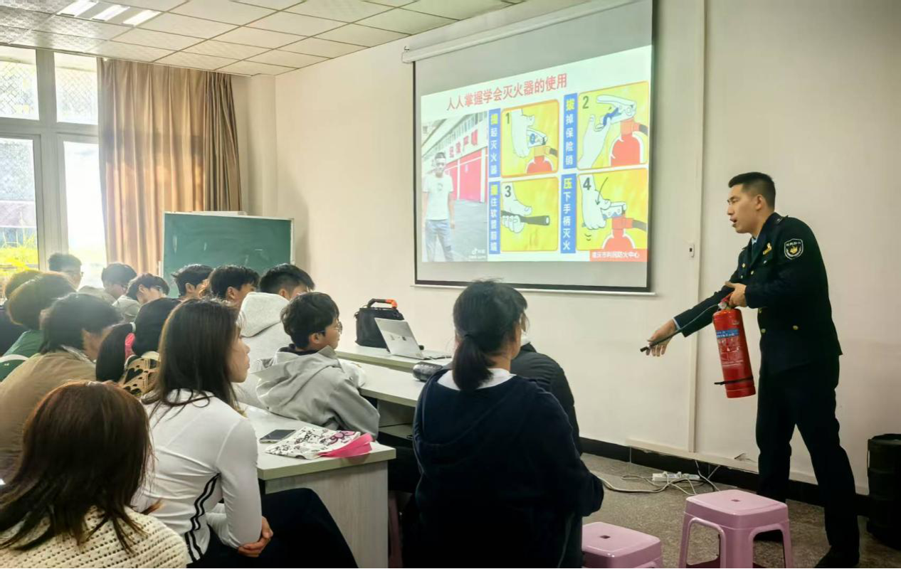 2025年11月13日,今年会jinnianhuicom在笃行楼4栋102教室开展消防安全知识培训,2025级全体学生参加。利民消防中心的黎教官为全体学生系统讲解了火灾防范与应对知识,并重点剖析了教学楼、寝室、实验室等校园场所的火灾安全隐患。理论宣讲后,黎教官现场指导学生进行了灭火器的操作演练。