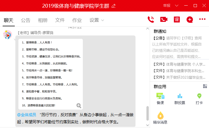 一粒米、千滴汗,粒粒粮食汗珠换!尽管我国粮食生产连年丰收,但对粮食安全还是始终要有危机意识。为强化学生节约粮食、珍惜粮食的精神意识,今年会通过召开“粒粒皆辛苦、滴滴全是爱”主题班会、“厉行节约、反对浪费”主题周前会、QQ群转发“珍惜粮食”宣传标语、微信群转发相关“节约粮食”主题文章等形式,深入贯彻学生节约意识,让学生明白节约是一种美德,从身边的小事做起,节约一度电、一滴水、一粒米入手,养成勤俭节约的好习惯。
